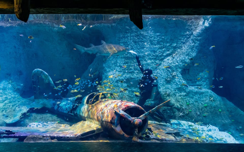 Ticket options include general admission for access to all zones, the “Beyond the Glass” pass for behind-the-scenes access, and the Bu Tinah Dhow ticket with a glass-bottom boat tour. The aquarium is part of the larger Al Qana complex, offering additional leisure experiences such as a cinema, marina, entertainment center, and sports facilities.
